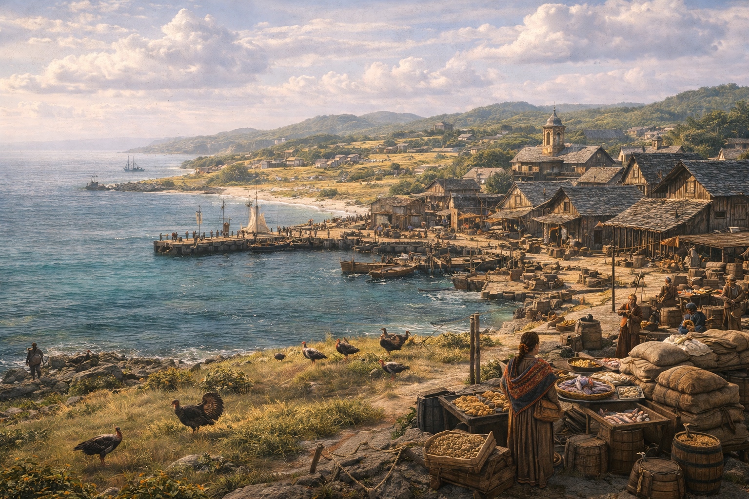 The smell of Delsol reaches you before the docks do — salt air mixed with something warmer, earthier, unmistakably alive. The wild turkey flocks that roam the western plains are not just a source of income; they are the ambient sound and constant presence of the island. Their gobbling carries on the wind, a background to everything that happens in this town.