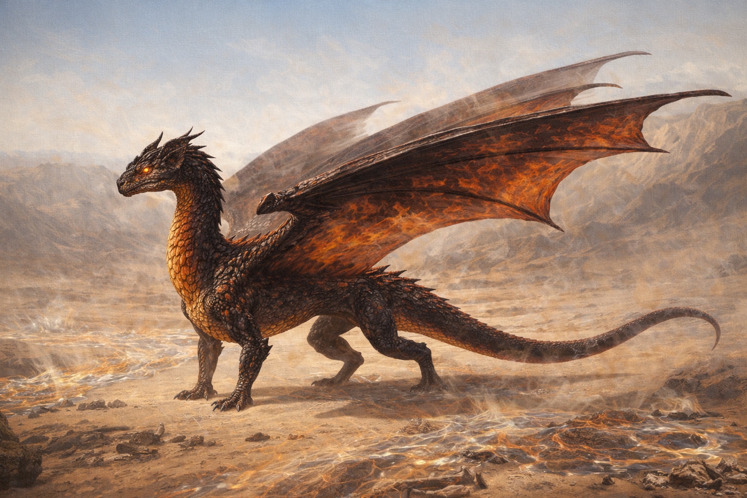 A fire dragon of middling size but extraordinary temperature, capable of burning at heats that melt stone rather than merely setting it alight. Ember Dragons are distinguished from standard fire dragons by the glowing core visible through their chest scales — a furnace that never fully cools, even in death.