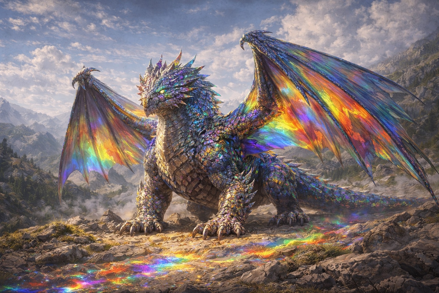 A rare and unsettling dragon that refracts light through its crystalline scales, bending and scattering radiance in ways that make it nearly impossible to pin down visually in direct sunlight. The Prism Dragon's breath is a concentrated beam of refracted light — blinding, burning, and capable of igniting anything flammable at considerable range.