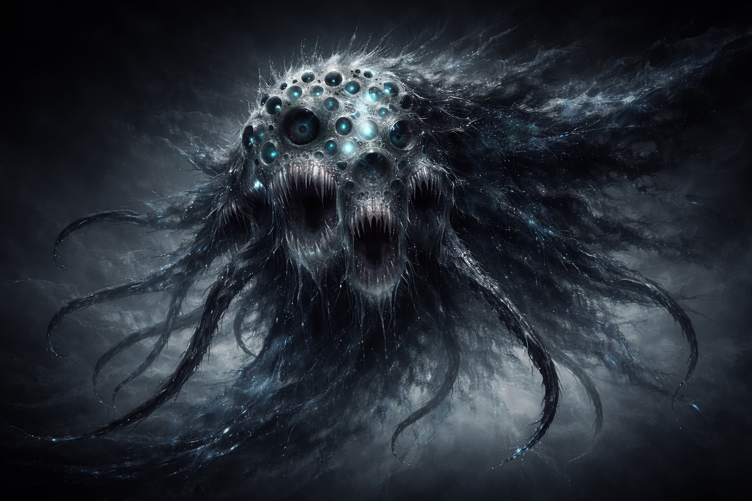 A mass of mewling, half-formed mouths and eyes that functions less as a creature and more as an event — a localized zone of psychic noise that disorients everything nearby. Gibbering Spawn are believed to be the consequence of Void contamination seeping into organic matter, producing something that wants nothing, fears nothing, and simply generates chaos as a byproduct of existing.