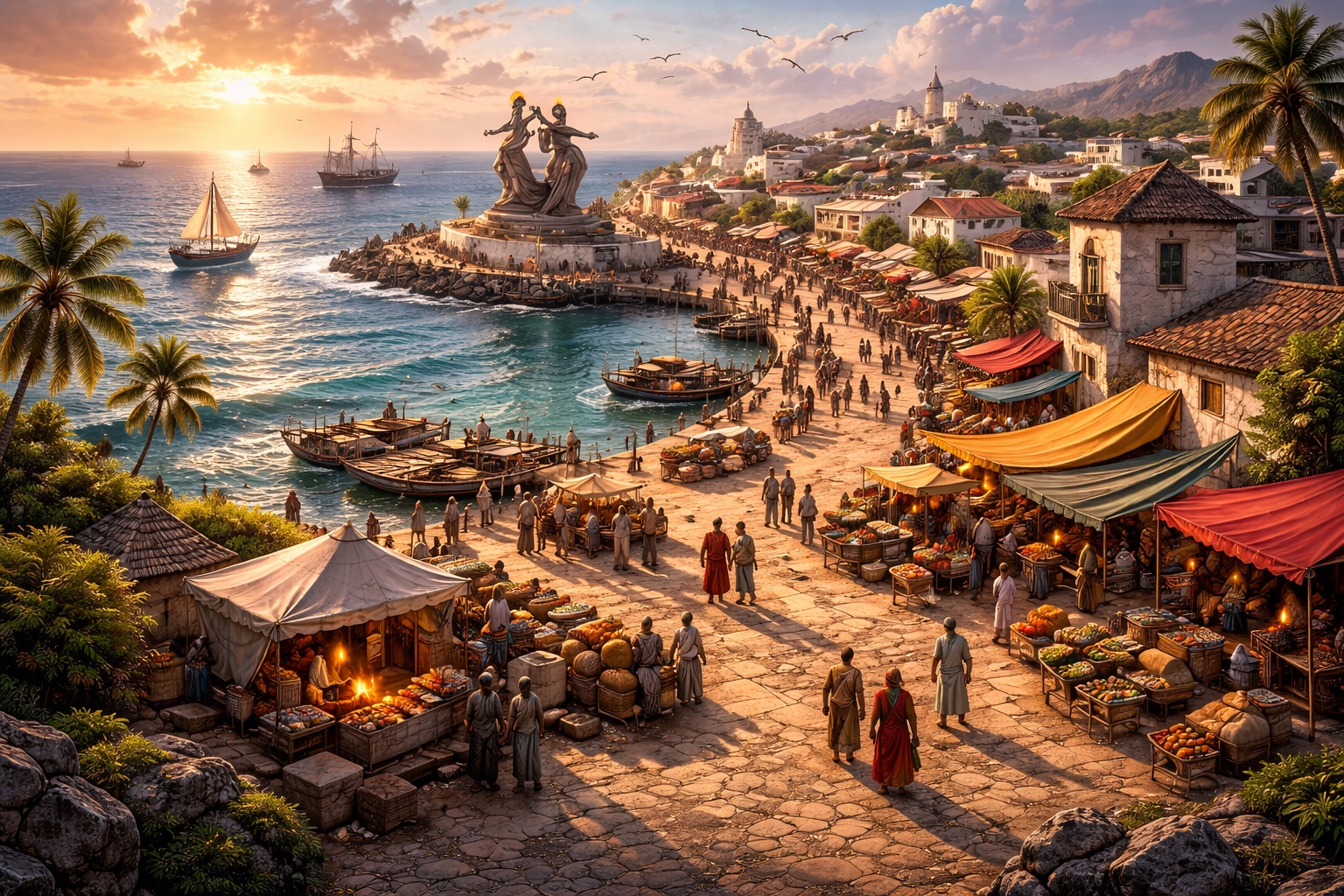 The architecture runs low and wide — whitewashed stone near the harbor, with colored tile roofs in the middle districts that give the city its distinctive look from the water. The streets are organized around the harbor road, a main artery that runs the length of the waterfront and contains most of the commerce. Off this road, lanes wind up toward the residential districts where the city's class structure becomes visible in the clothing of the people: plain white for those who are still working their way up, dyes and patterns for those who have.