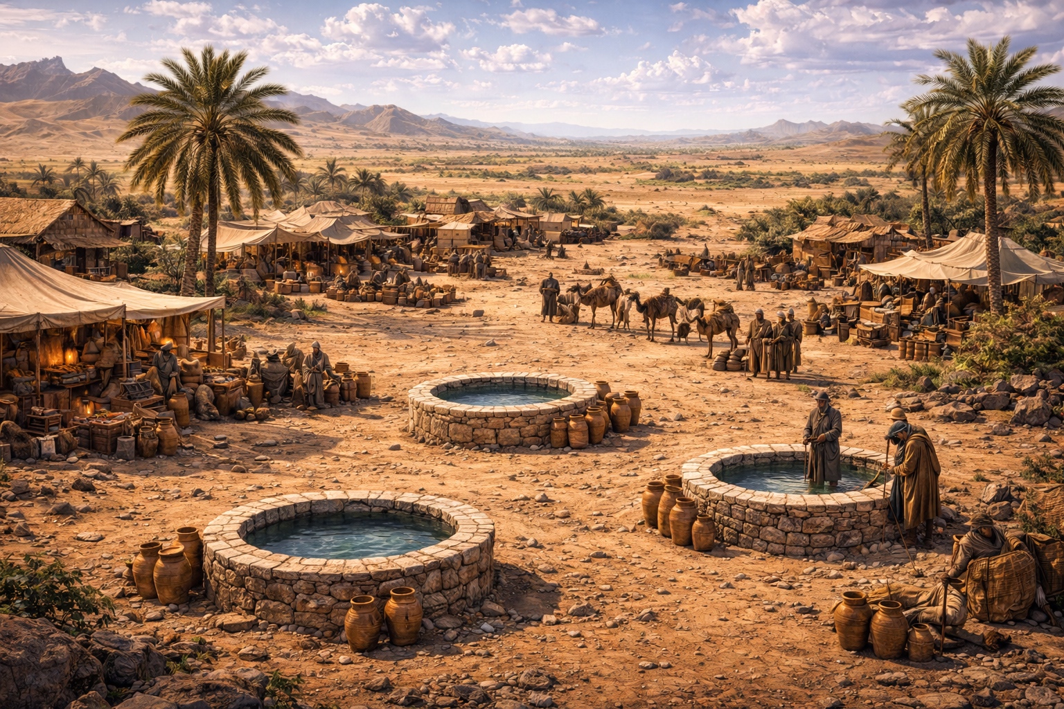 Water Trade is the foundation. The three public wells produce enough water to support the permanent population and provide excess for sale to nomadic peoples and traveling caravans. Kwame Nia personally oversees the primary well, setting water prices (kept deliberately low to prevent wealth concentration), managing maintenance, and ensuring fair distribution. The secondary wells are managed by appointed assistants under his ultimate authority.