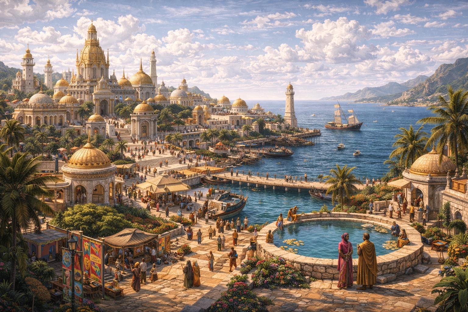 - The Historic Center — The original city within the inner wall. Dense, busy, mixed commercial and residential; the Great Bazaar at its center. The founding well, now a landmark rather than a water source, is in the central square.