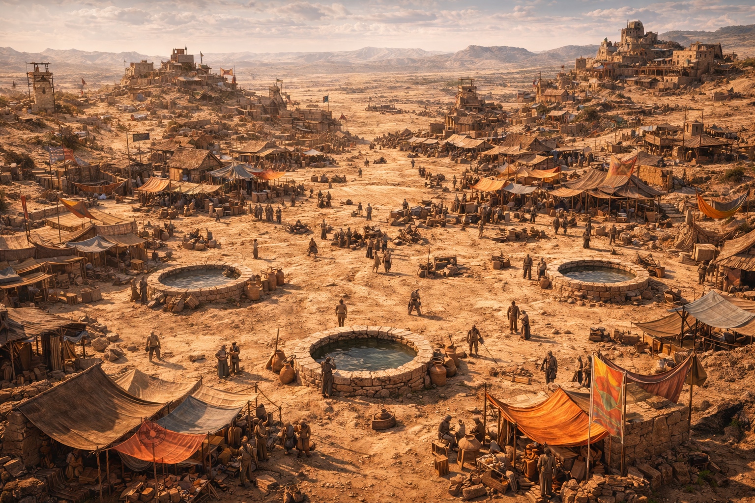 Melfi emerges from the rocky highlands like a scar in the landscape—a sprawl of makeshift structures clinging to four vital wells scattered across the arid terrain. The architecture is brutal and improvised: buildings cobbled from scavenged wood, sun-bleached stone, canvas tarps lashed to rough frames, and materials clearly repurposed from caravans and raids. Dust hangs perpetually in the air, and the smell of sweat, animals, and unquenched thirst permeates every street.