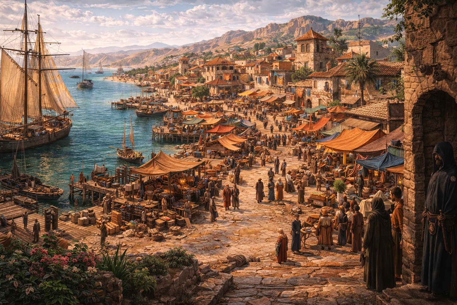 The town is positioned at the exact point where the sea trade route meets the caravan route to Irbi (to the northeast). This strategic location makes it a natural trading post and a gathering point for merchants, adventurers, mercenaries, and those fleeing the law.