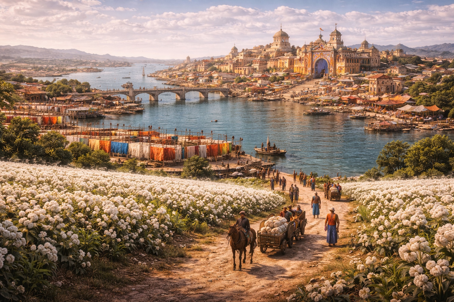 Cotton is the foundation. The farms west of the city produce raw cotton, the Mills process it, the dye houses color it, and the finished textile leaves through the lagoon port. This chain employs more of Tontou's workforce than any other industry and sets the city's commercial relationships with Jazirah and Irna.