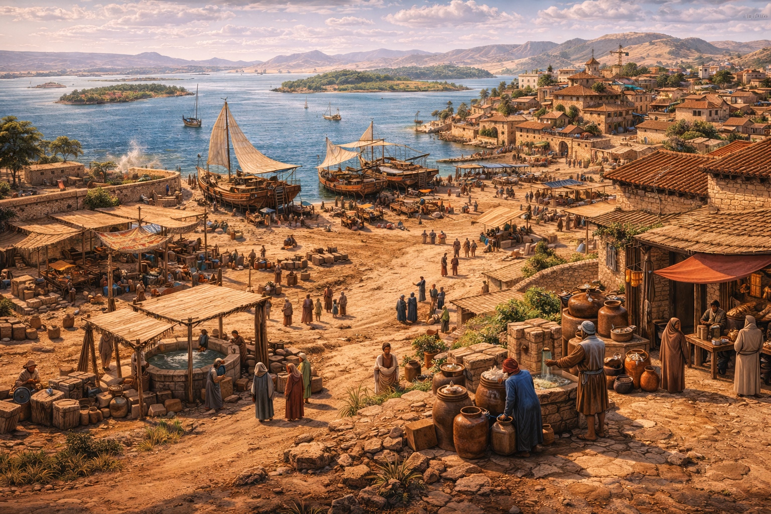 The settlement is modest but deliberate. Stone-and-clay structures with thatched or tile roofs cluster near the waterfront, gradually spreading inland toward the garden plots and grazing lands that feed the population. The architecture is built for durability and temperature management — deep eaves, open courtyards, colored walls to reflect or absorb the sun as needed. Everything that can be moved is moved daily according to the heat and wind.