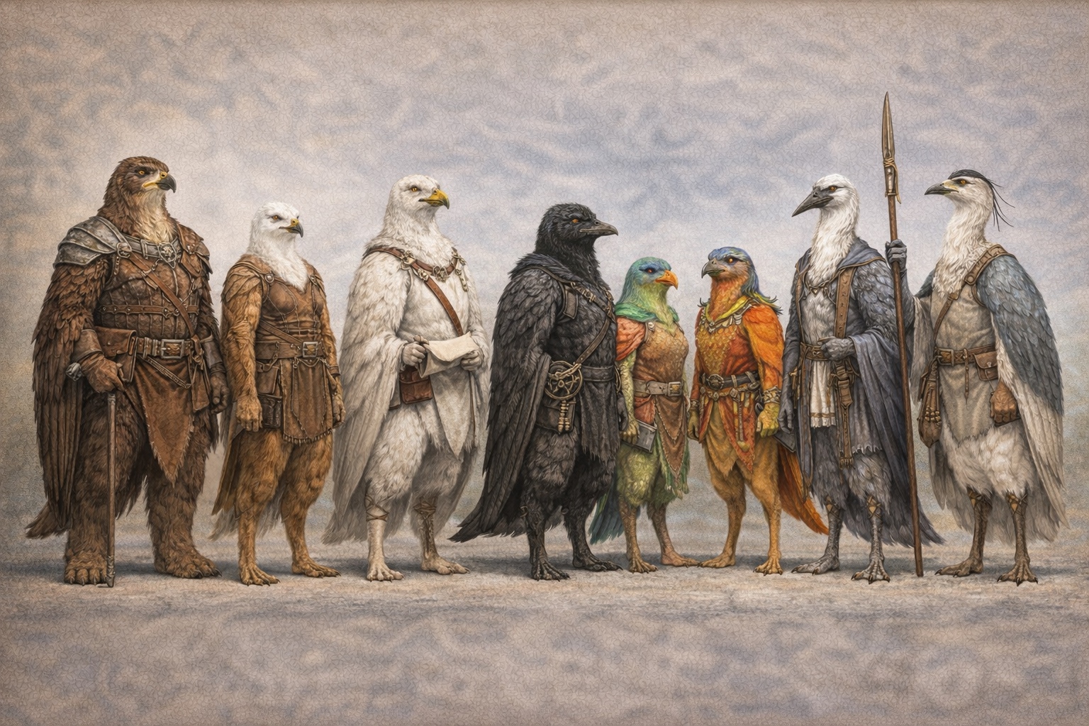 - Elves (Aelvari): A relationship of aesthetic appreciation and mild philosophical tension. Both peoples value precision and elegance; both have long histories and careful attention to tradition. The tension is between the Aelvari preference for ground-level depth and the Aviari preference for aerial breadth — each finds the other's perspective partial in interesting ways.