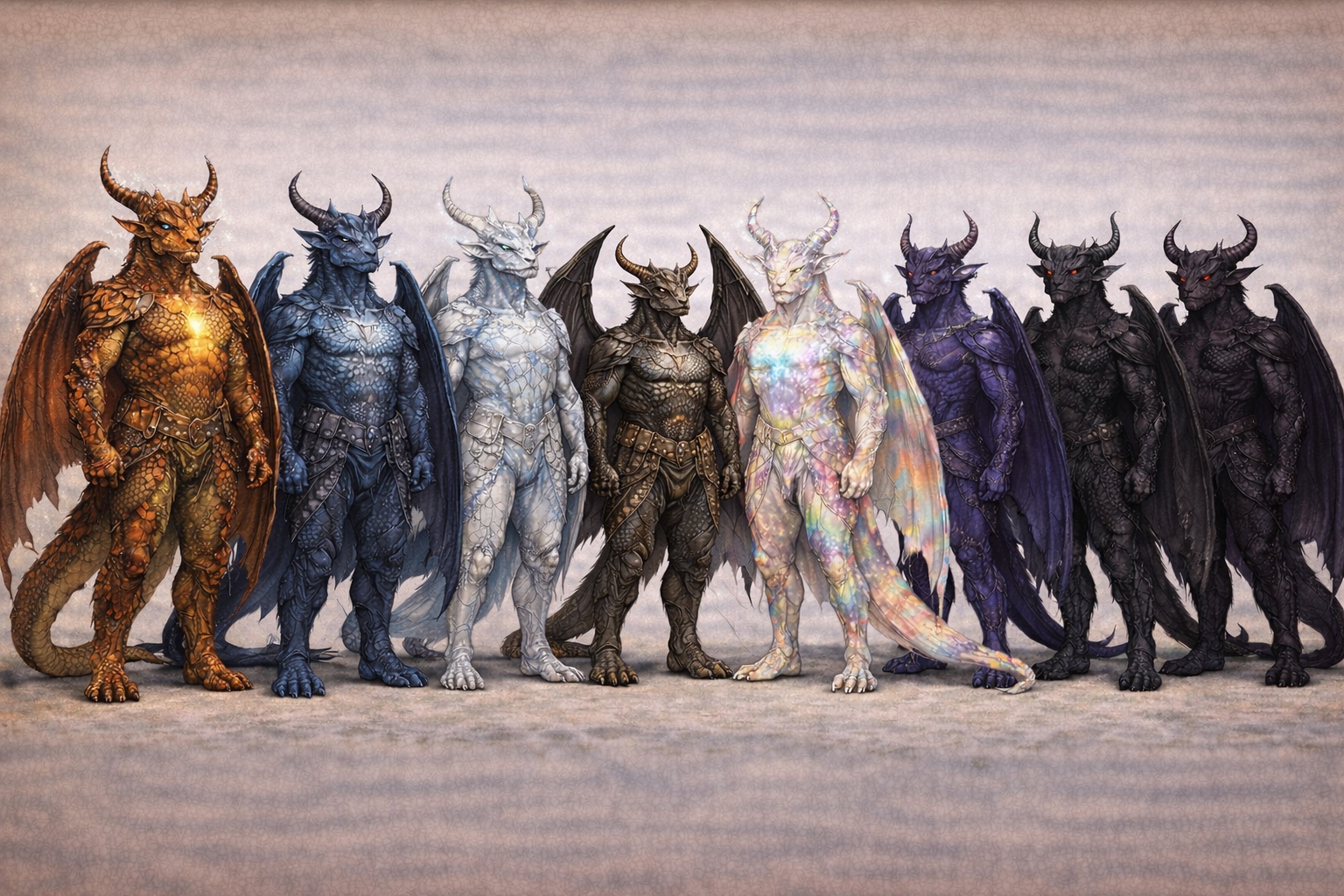 Drakin are a people born from the deep history of Dort's dragon lineages — the rare offspring of unions between true dragons and the mortal peoples with whom some dragons, over long centuries, formed genuine bonds. They carry unmistakably draconic features: scales, wings, horns, a tail, elemental breath, and eyes that have never forgotten what their ancestors were. What marks them most distinctively is their mosaic scale pattern — rather than the singular, pure coloration of a true dragon, a Drakin's scales present in layered, interlocking fields of multiple colors, the chromatic inheritance of a heritage that bridges kinds. This is the visible mark of what they are: something distinct from the dragons who preceded them, something that did not exist before and could not have been planned.
