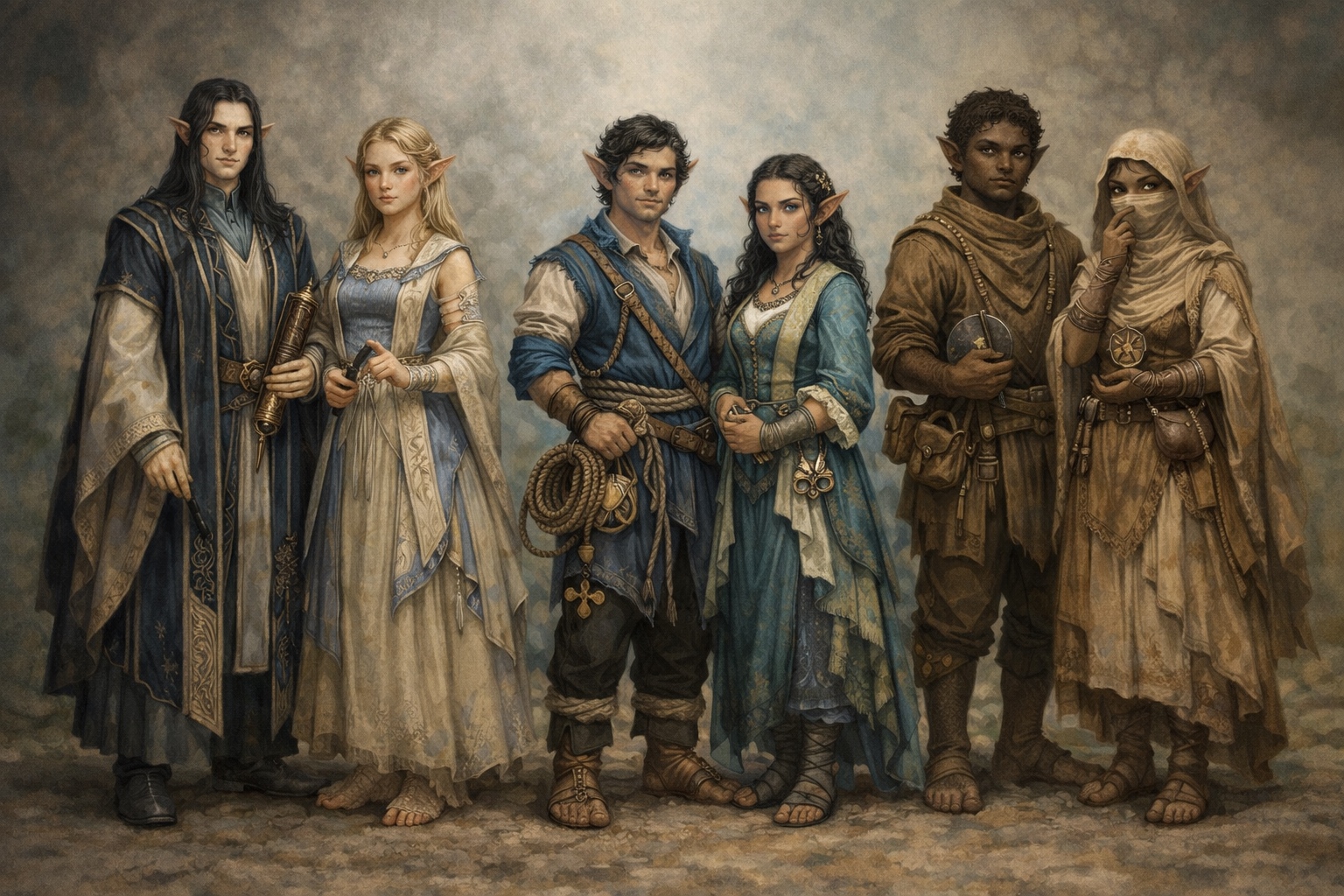 Sea Elves on Funta's coast dress for heat and spray simultaneously — thin, salt-resistant fabrics in layered wraps that can be added or removed quickly, with a preference for natural dyes that do not run in saltwater. Shoing Sea Elves have incorporated regional craft aesthetics into their dress and ship-building in ways that distinguish them clearly from Funta or Irna Sea Elves. Sand Elves in Jazirah wear loose-fitting layers that manage desert temperature swings — cold nights, searing days — and cover exposed skin against sand and UV. All Sand Elf clothing is designed to be carried or packed efficiently when moving. High Elves in Irna dress for formality and permanence; their textiles are among the most elaborate on the continent.