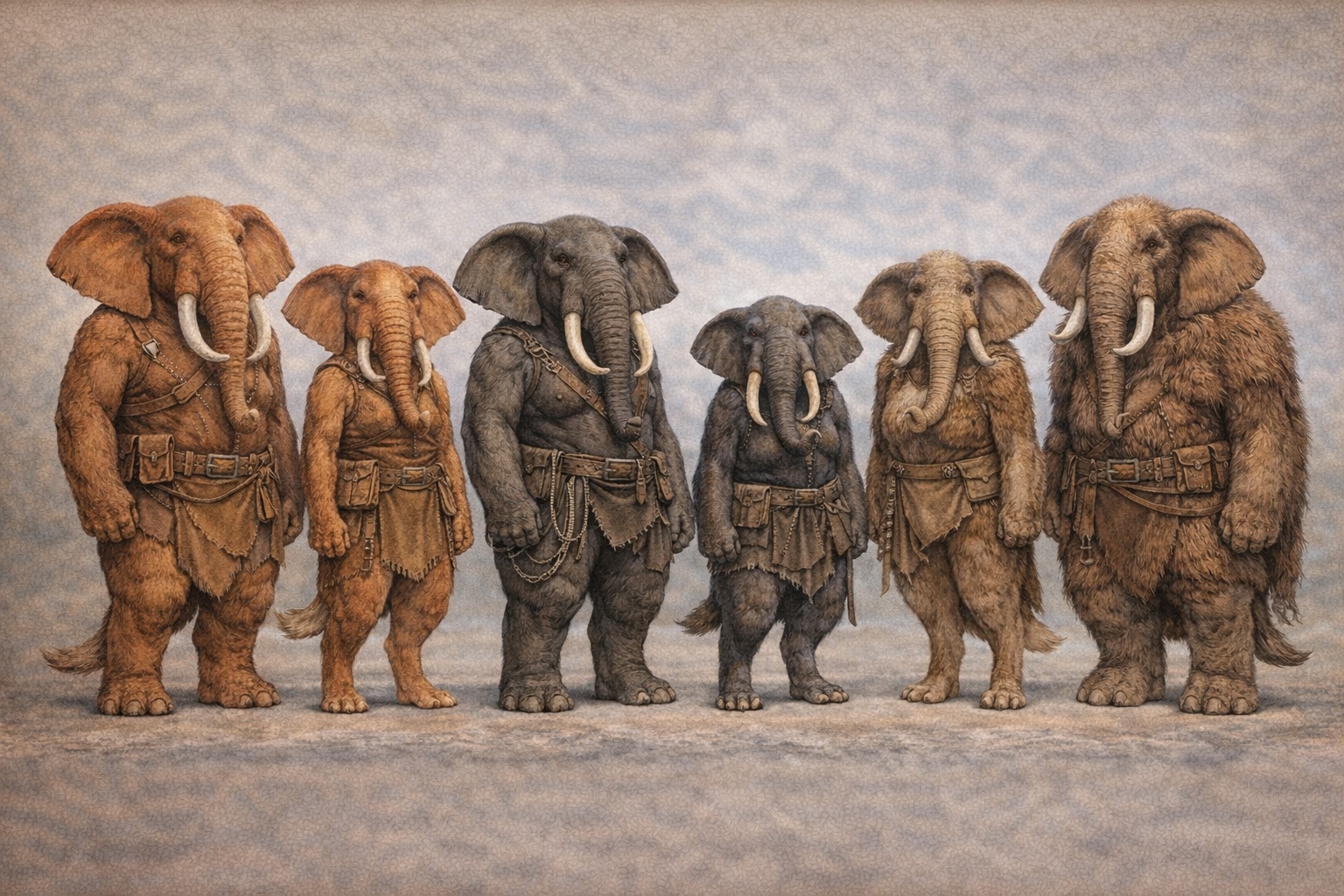 The Pachari are immediately and unmistakably the largest people in any room they enter. Their silhouette is unmistakable: the great rounded head with its broad ears, the trunk — a fully functional manipulative organ that extends from the face and serves many of the same purposes as a hand — the pillar-like legs, and the dense, smooth or moderately-furred skin that varies in color from pale grey through warm brown to deep charcoal. They are bipedal and upright but carry their mass differently than any other people — the Pachari's weight distribution creates a characteristic low-centered-gravity posture that makes their movement quieter and more deliberate than the frame would suggest. When a Pachari chooses to be silent, they are silent. The awareness that something capable of that stillness is watching is something most peoples experience before they consciously register what they are seeing.