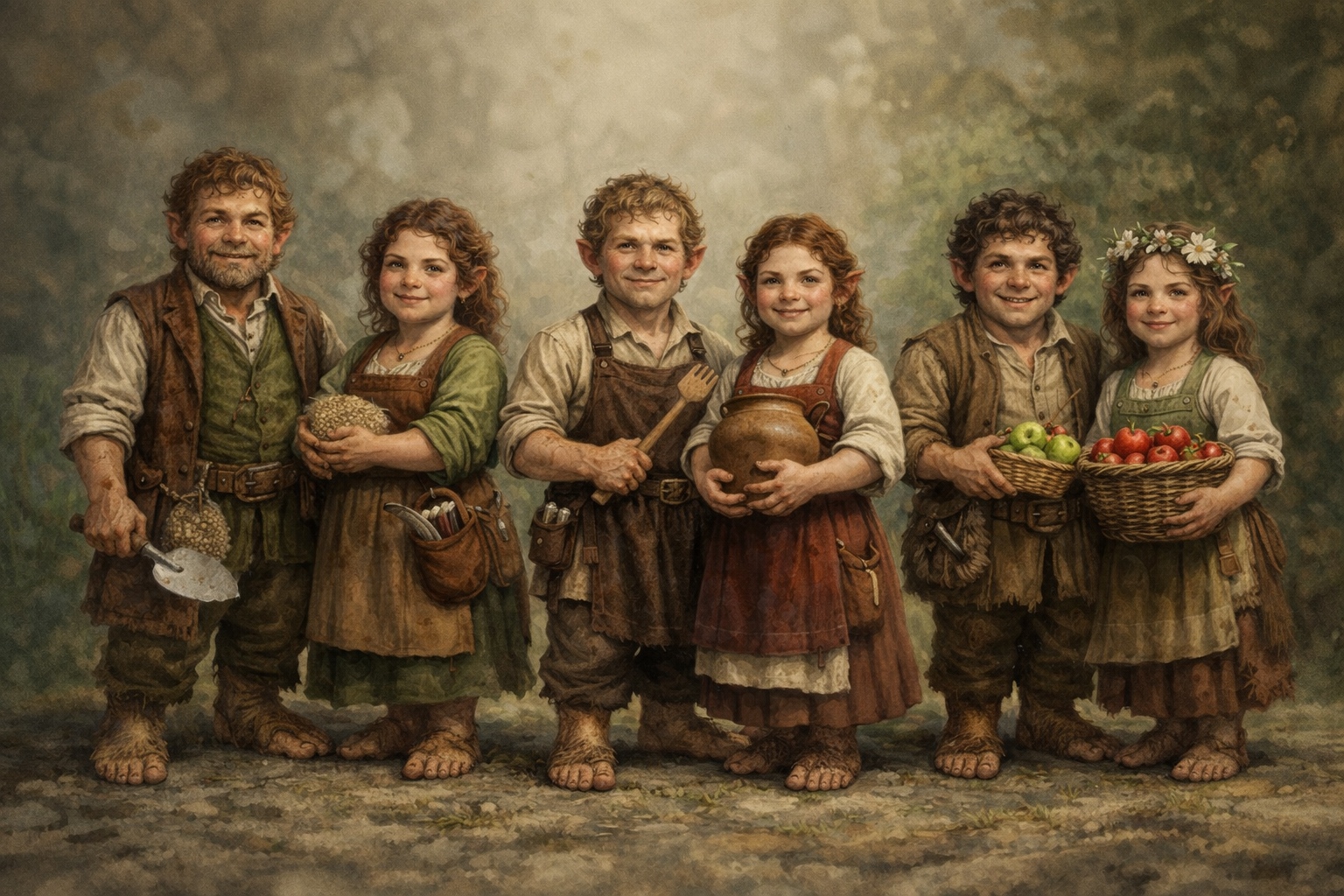 The first read on a Smaling is comfortable and rounded — not soft in a weak sense, but in the sense of a people who are well-fed, well-rested, and built for working proximity to the earth rather than for the vertical ambitions of taller peoples. They stand between 2'8" and 3'4", with proportions that are humanoid but compact, and a characteristic solidity to their feet and lower legs that makes their posture unusually grounded. Faces tend toward round, broad-featured, and expressive — Smalings smile easily, frown with their whole face, and laugh with obvious involvement of their entire upper body.