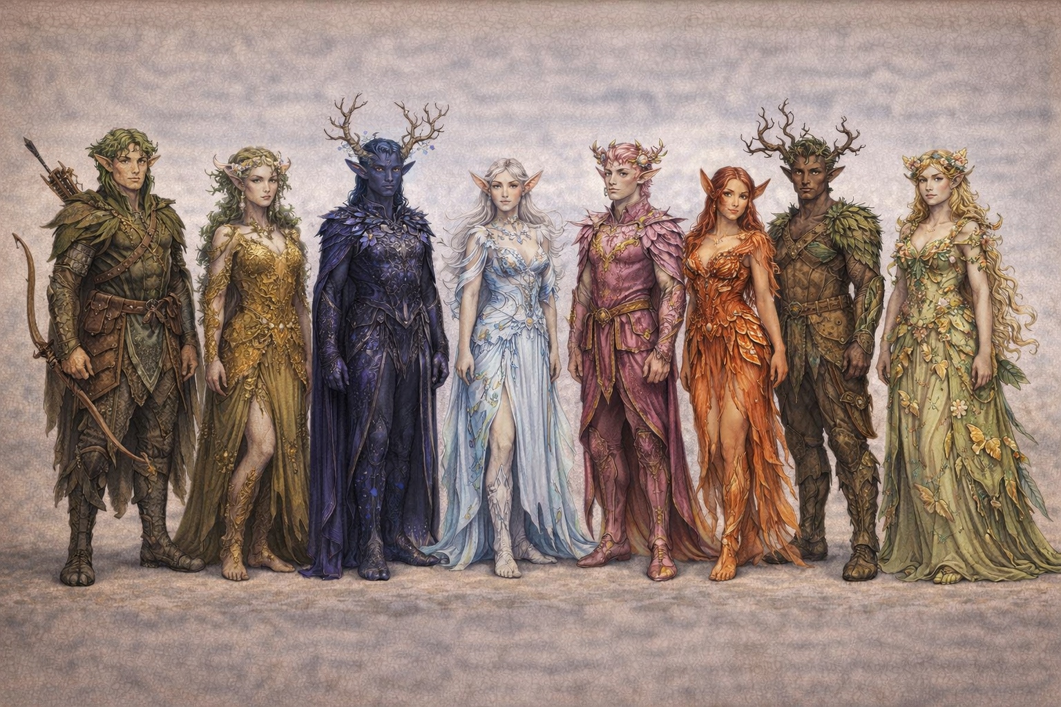 The Vaelhari read immediately as elf-adjacent — tall, lean, with the long limbs, pronounced cheekbones, and pointed ears that mark the elven family. The resemblance is real and the relationship is genuine, though the question of which people preceded which has generated more academic bitterness than it deserves. Where the Vaelhari diverge from the elven baseline is in what their bodies do over time and circumstance. A Vaelhari standing still in a neutral phase looks like a particularly striking elf. A Vaelhari in active transition looks like something else entirely — something that has never been quite fully present in this world, which is, in one sense, accurate.