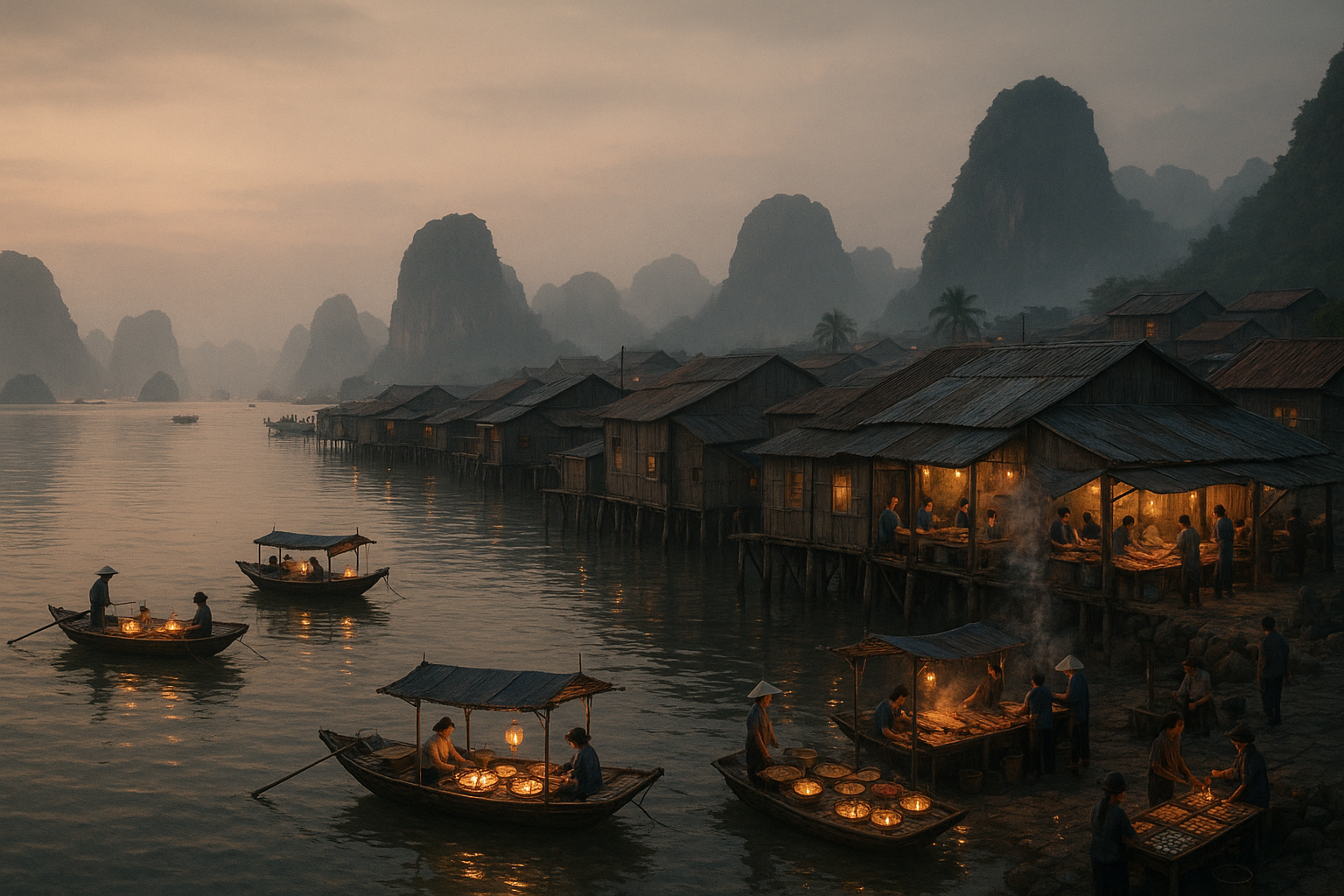 - The Cam Pha Night Market — The central market runs continuously, but its night configuration — lit by oil lamps and braziers, with a narrowed selection focused on prepared food, small goods, and perishables — has a distinct character from the daytime market. Visitors who arrive by evening ship find this the first and most memorable thing about Cam Pha.