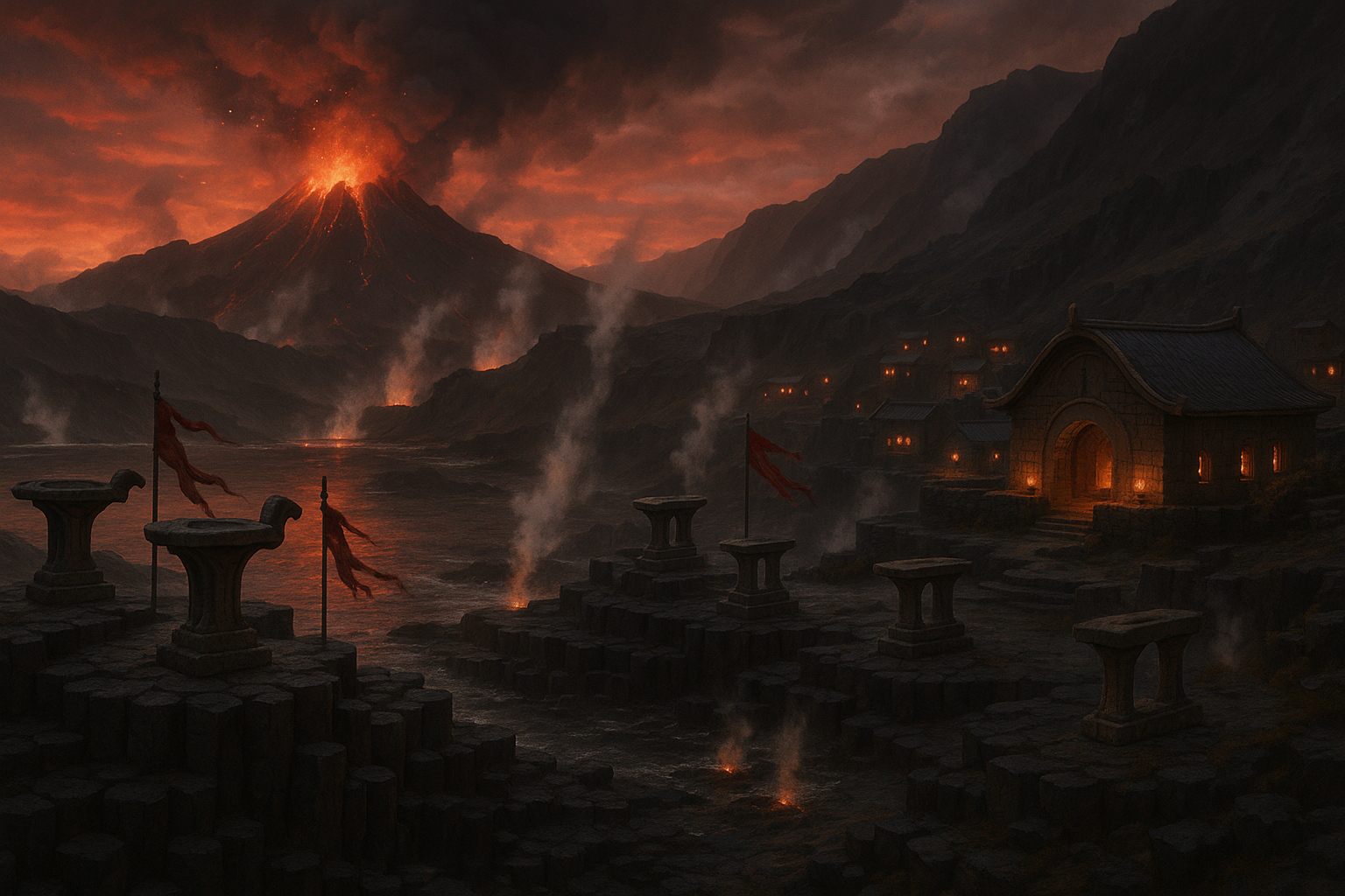 The town occupies the western slope below the caldera rim, built in a material that makes its origin obvious: the stone is volcanic basalt, dark grey and dense, and the buildings do not burn. They were constructed to be in this location, near these vents, in this heat, and they show it. The architecture is heavy, low-slung, with small windows and thick walls — not for defense but for heat management. The upper reaches of the town, where the slope steepens toward the rim, are the Tsurugi compound and the bonding grounds: a series of terraced stone platforms where the Flame Runners land, are tended, and — when the conditions are correct — reproduce.