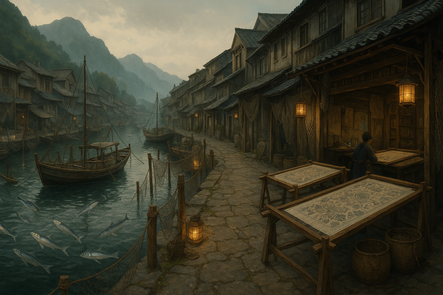 Galshi grew from a fishing camp at the inlet's best tidal anchorage. The silk tradition was a later development — a weaving family from inland Shoing who arrived seeking a quieter location recognized the inlet silkworm's quality and established the first mulberry grove. The two economies coexisted without formal connection for a generation before the embroidery tradition began to integrate silk with the fishing community's patience for intricate work.