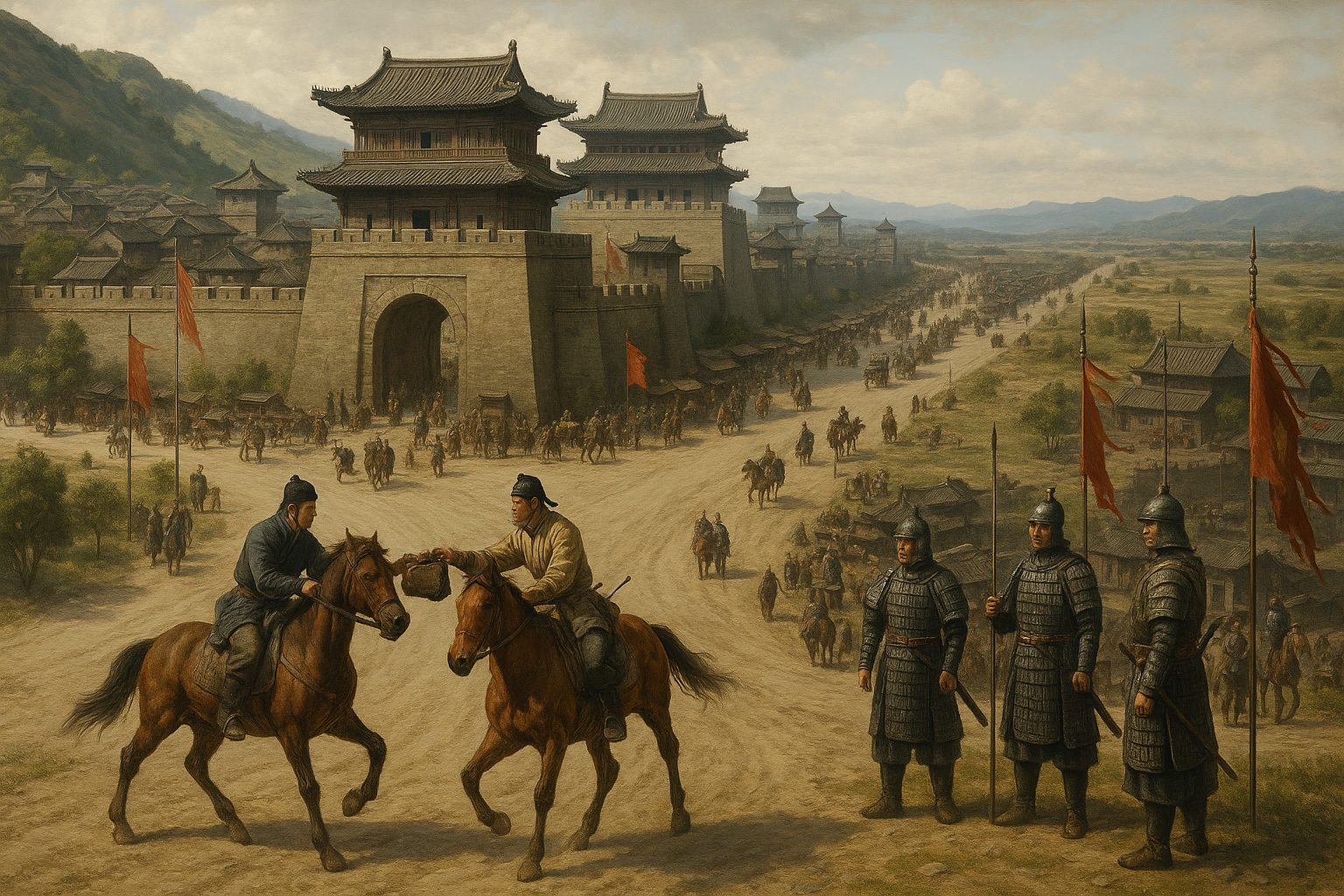 Four roads. That is the first impression — not the buildings, not the garrison, not the market. Four roads converge on the central plaza from four compass points, and each one is maintained to the Gwajin Realm's highest road standard because the military and commercial importance of the junction has kept the funding available consistently. The roads are straight where the terrain allows, paved with the local limestone, and wide enough for two loaded wagons to pass each other. By eastern Shoing standards, this is exceptional.