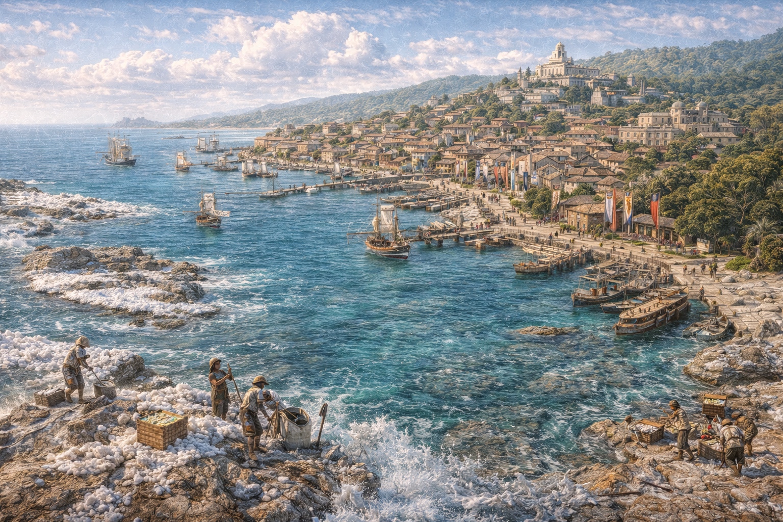 The salt crystals are the city's distinction. The harvesting method — developed by the fishing community originally and now under House Valerio oversight — produces a product used in culinary applications, alchemy, and medicinal preparations across Antaea and in export trade. The specific chemistry of the Bahia's reef-edge water is not replicable by formula; the crystals can only come from here. The method of final processing is not publicly known.