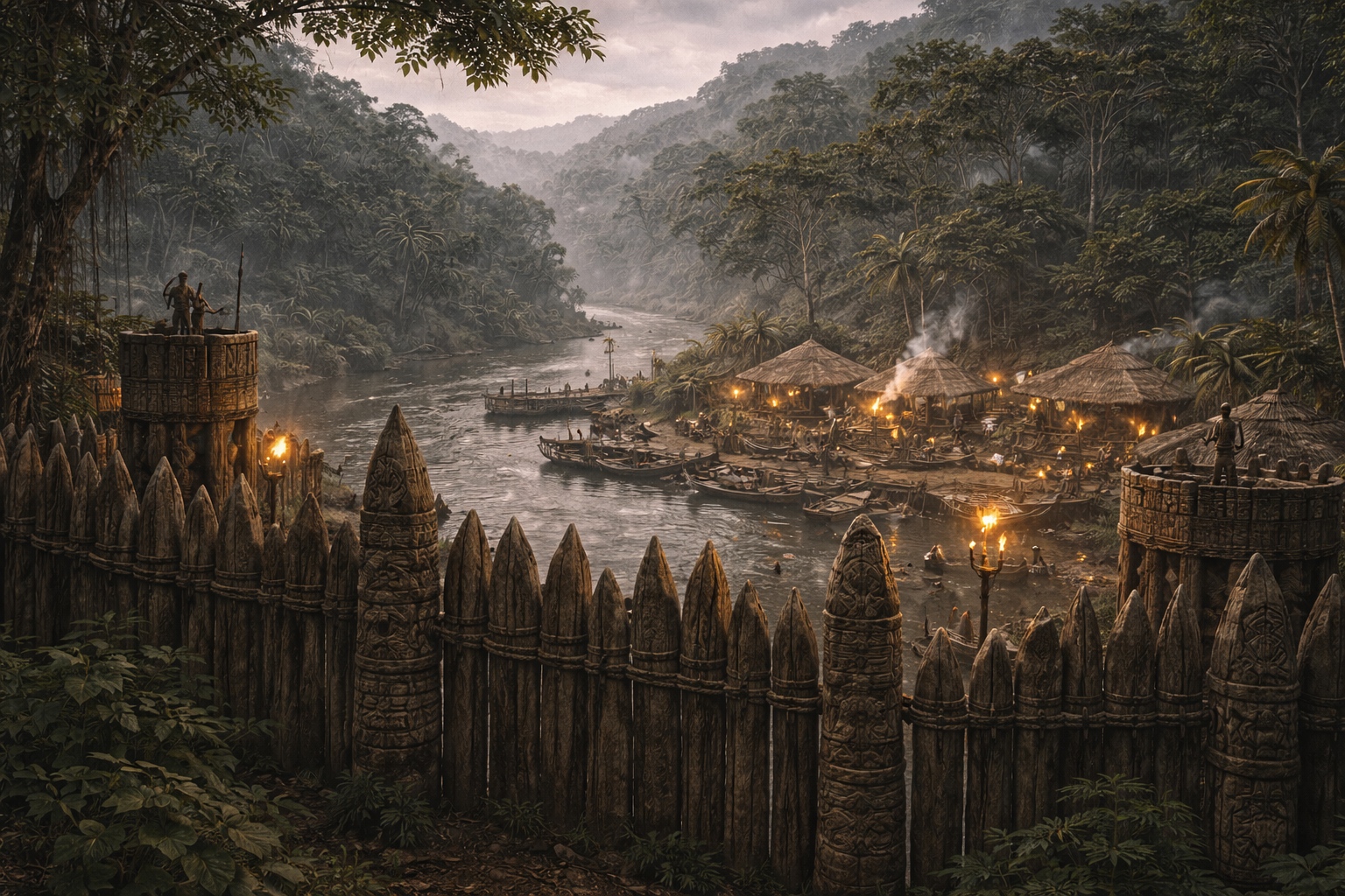 The palisade is the first thing you see — sharpened logs twice a person's height, hung with carved totems at regular intervals, the boundary between the Moriche Rainforest and the human space within. The forest presses right up to the wall's exterior edge, dense and dark even in daylight, alive with the sounds of birds and something that may or may not be birds.