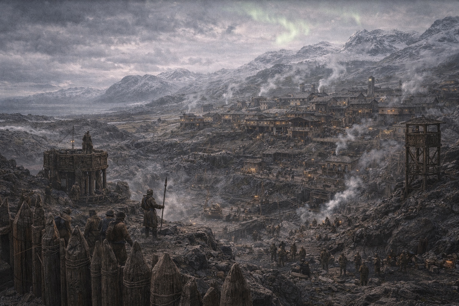 The climate is subarctic — long, brutal winters, brief summers that barely qualify as warm. The town is built to handle cold: thick stone walls, covered passages between key buildings, centralized heating in the larger structures. The forced labor population works regardless of temperature, which is considered a feature of the system rather than a problem.