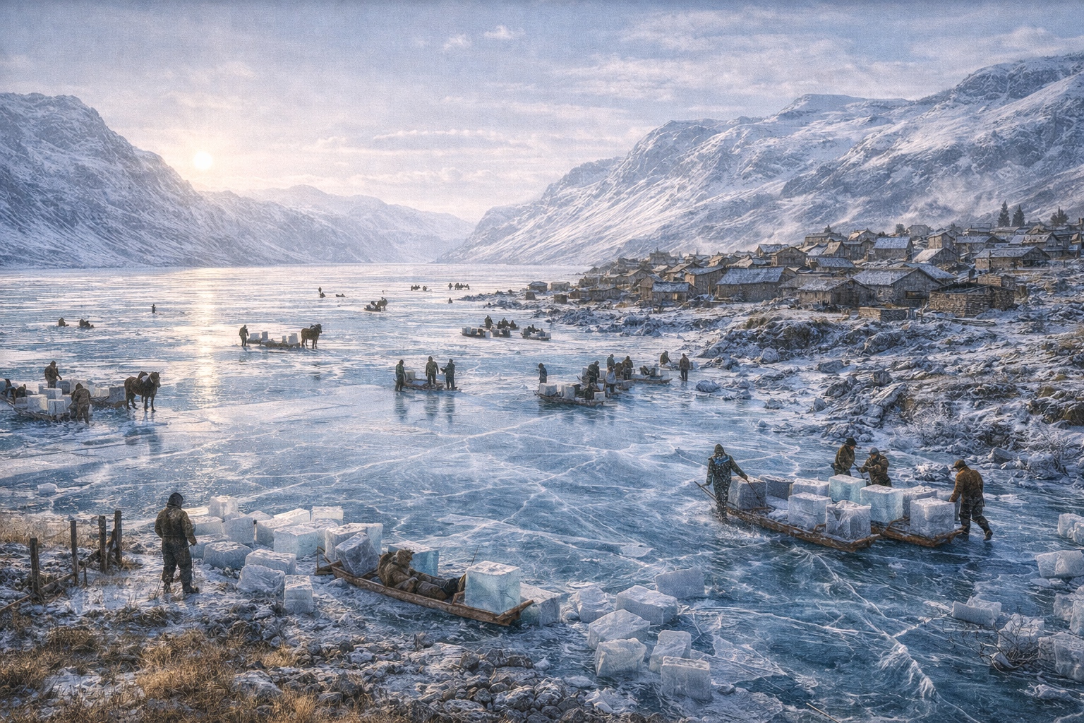 The climate is cold tundra — long winters, short summers, no period that could be described as warm. Snowfall begins in early autumn and does not fully clear until late spring. The lake freezes from November through April; during those months, the village transitions from open-water fishing to ice fishing and ice harvesting, using the frozen surface as both workplace and highway.