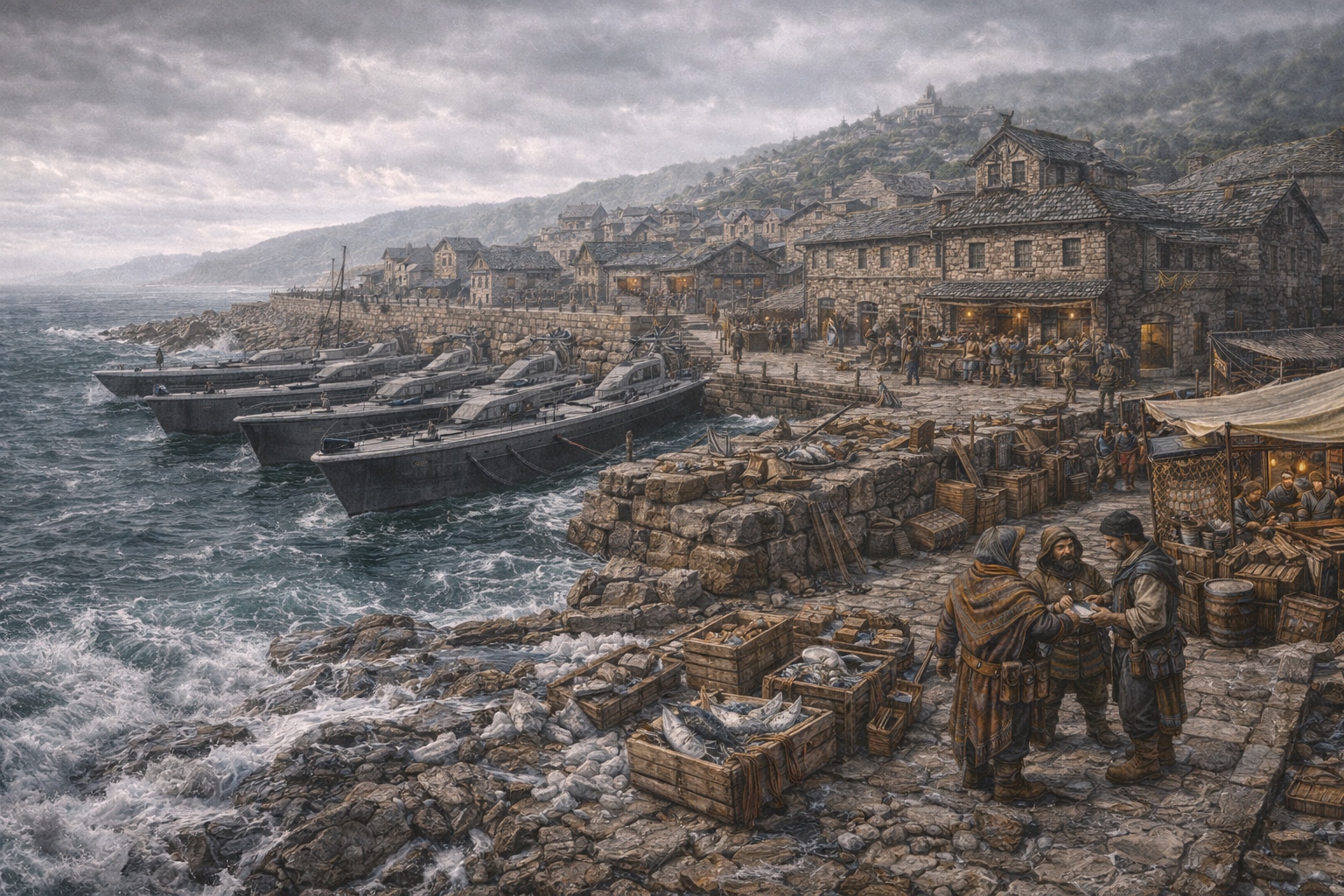 Fishing is the foundation — the northern Perian's cold-water species, including several varieties found only in this stretch of coast, produce catches that are highly valued in warm-water markets. The patrol toll is the second most significant revenue source; the one-gold-per-vessel charge generates substantial annual income from the volume of traffic through the corridor, distributed between the Patrol Administration (for fleet maintenance and crew wages) and the Confederation's general fund (per the current fiscal arrangement, which Sonoro considers insufficiently generous).