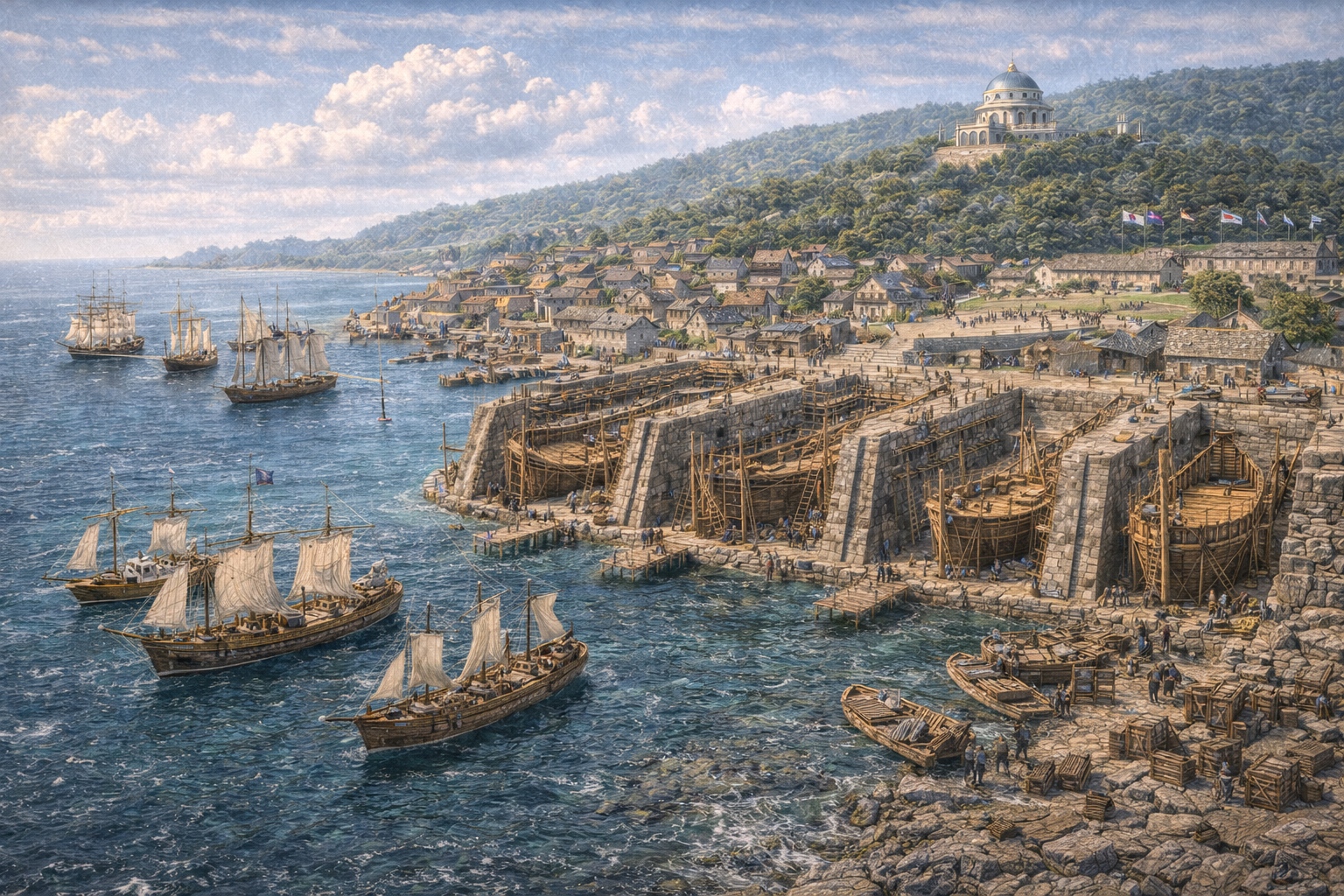 Shipbuilding is the primary industry in every sense — the dry docks operate continuously, producing the warships and patrol vessels that the Heavens Sphere requires and the merchant vessels that other customers commission. The Naval Academy is the second significant economic driver: the training fees, the accommodation of cadets and instructors, and the ancillary commerce around both are substantial. Fishing operates as food security. The timber industry supplies both the shipyards and an export trade in worked lumber.
